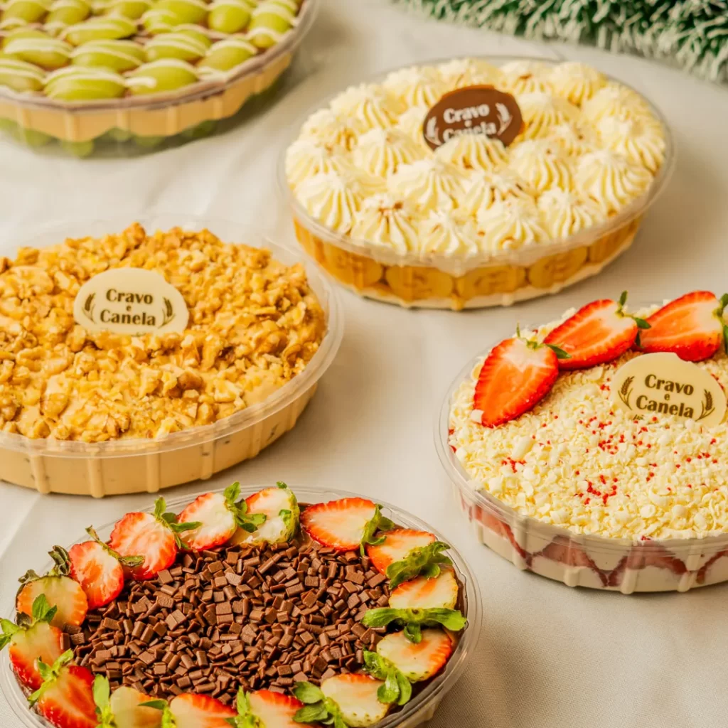 Abacaxi, Amendoim, chocolate, morango, pêssego. Camadas de creme, biscoito e frutas montadas em camadas. Sabor tradicional.