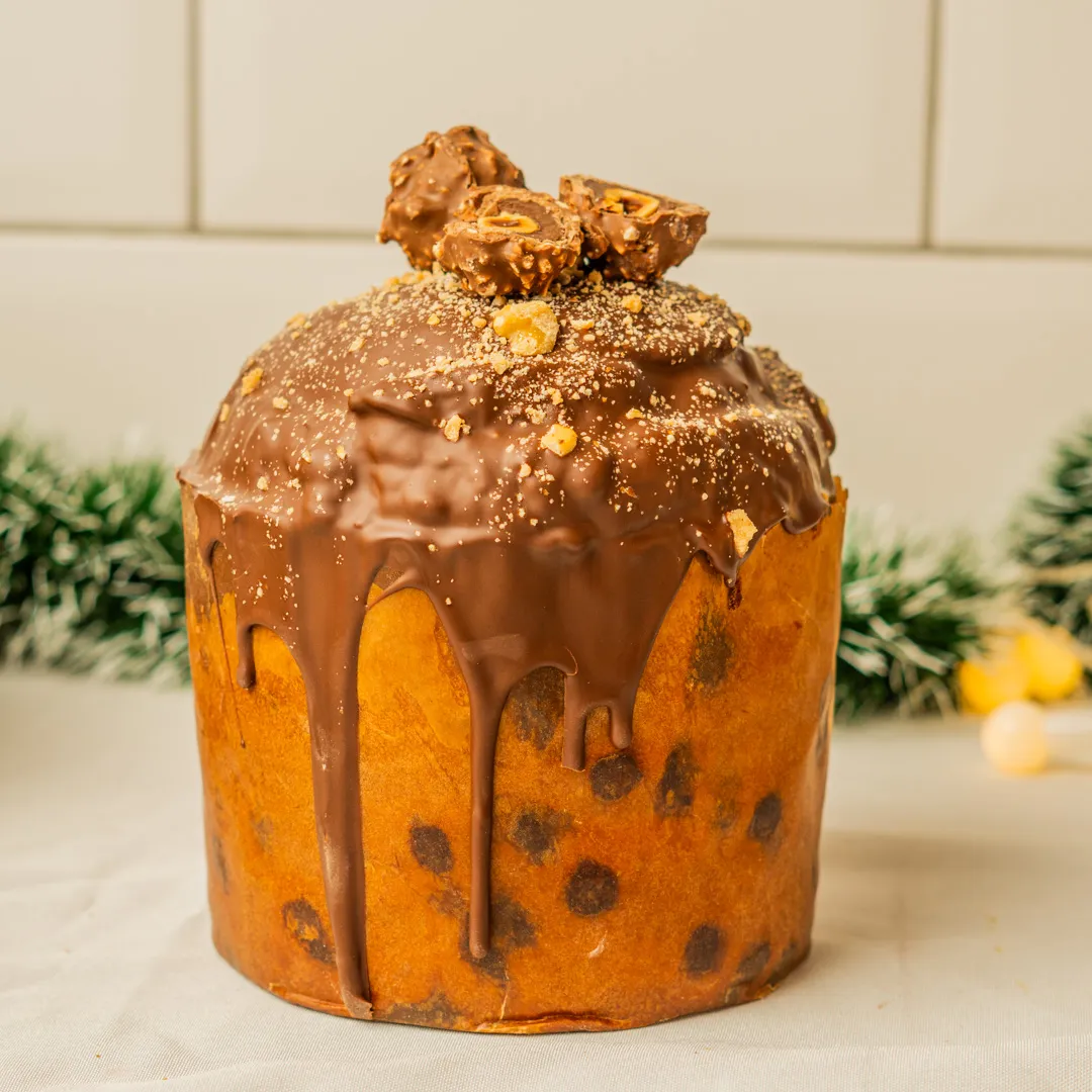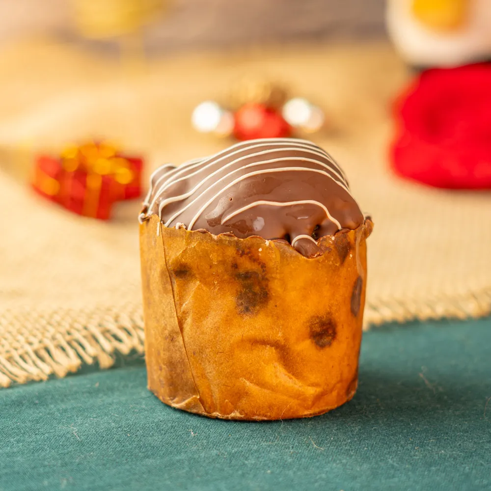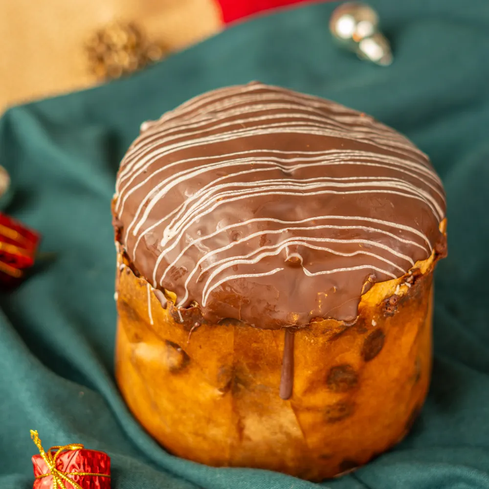 Massa tradicional de panetone com chocolate em gotas e cobertura de chocolate ao leite.
