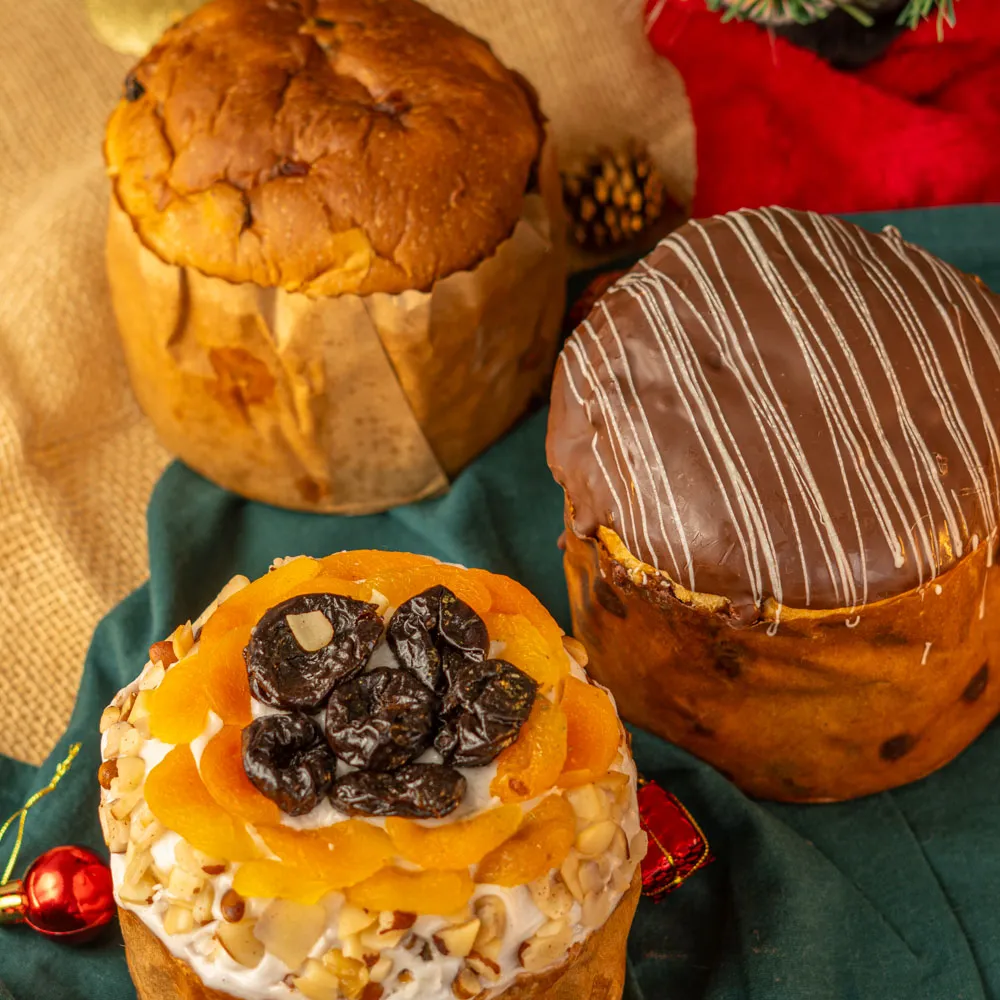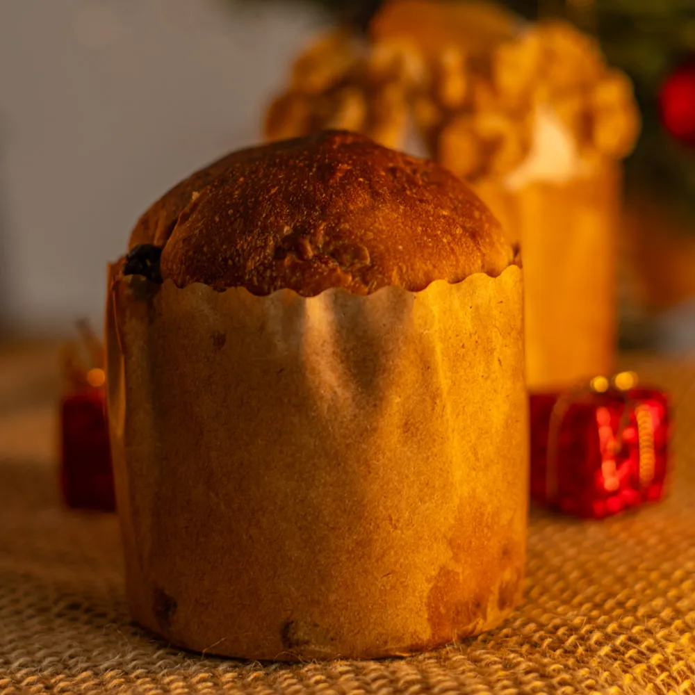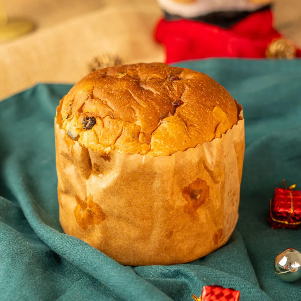 Massa tradicional de panetone com uvas passas e frutas cristalizadas.