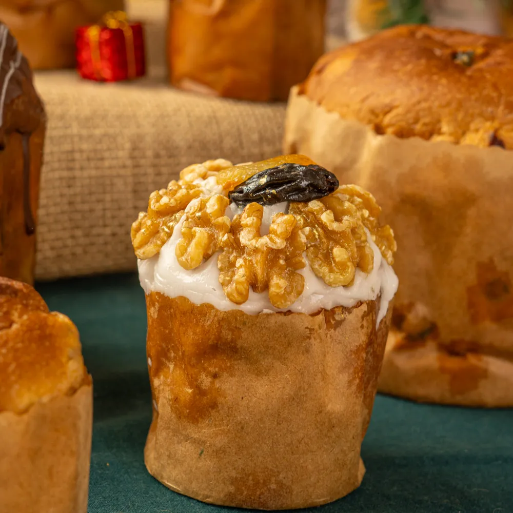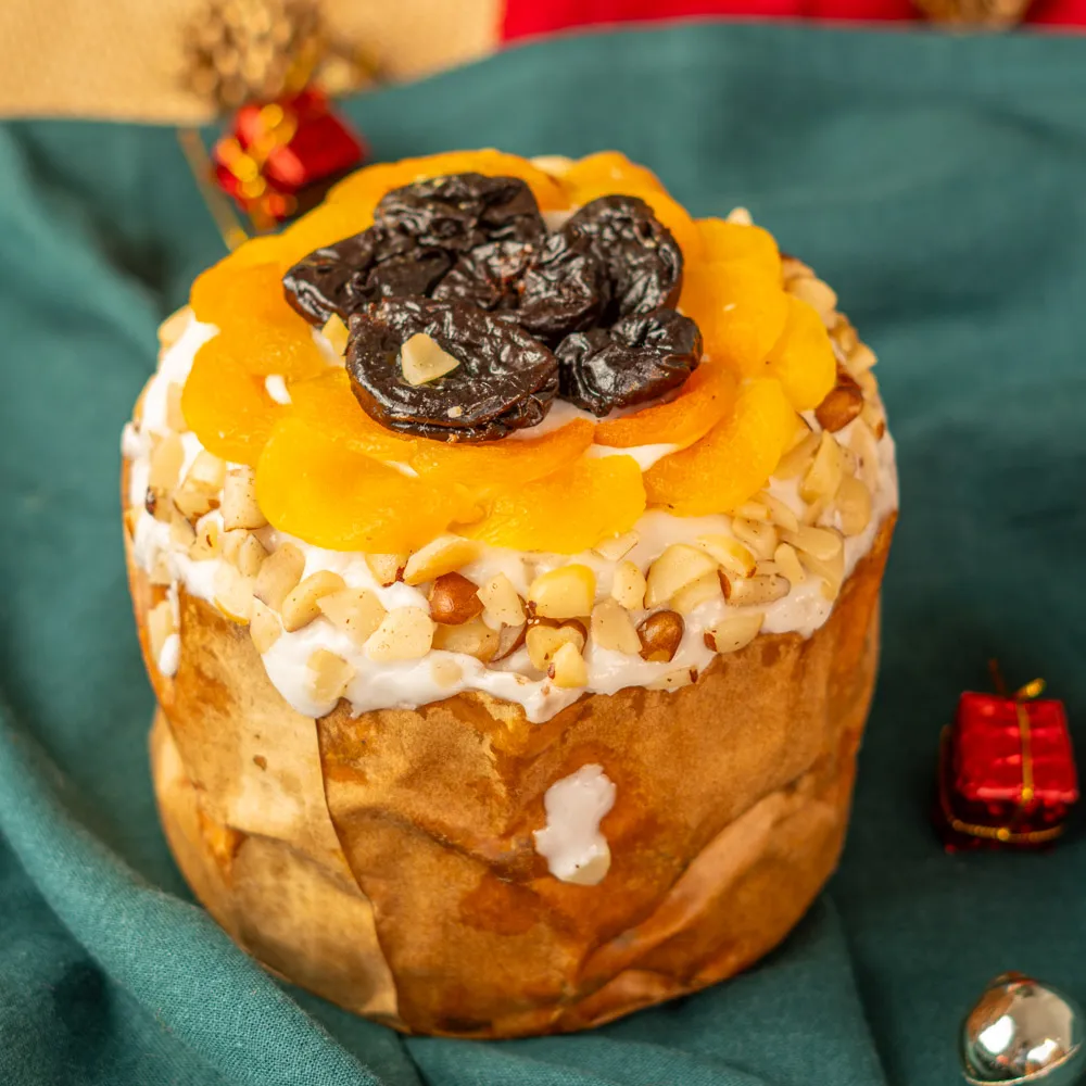 Massa tradicional de panetone com uvas passas e frutas cristalizadas. Cobertura de Fondant, nozes, castanhas e frutas secas.
