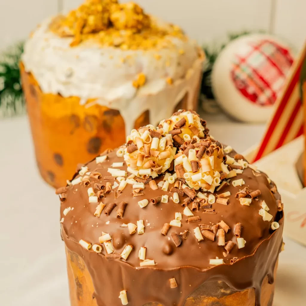 Massa tradicional de panetone com chocolate em gotas e cobertura de chocolate ao leite.