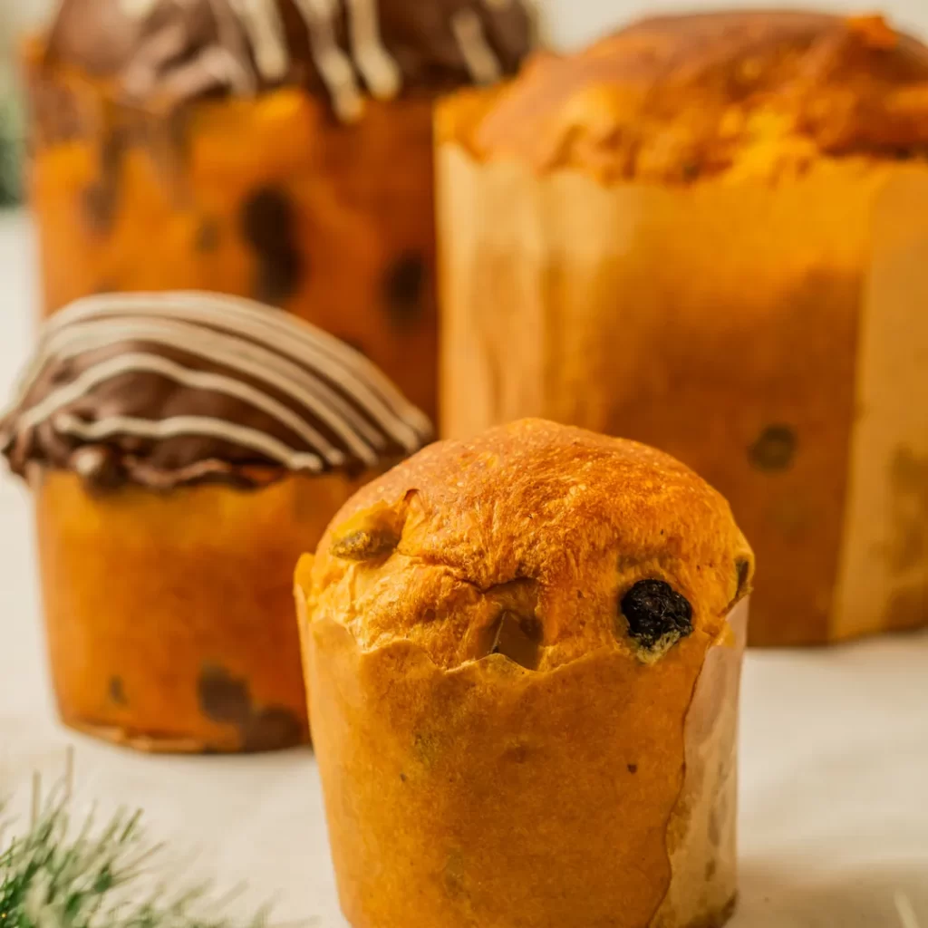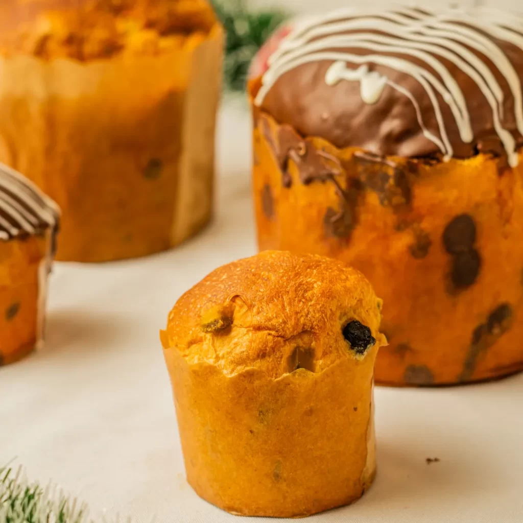 Massa tradicional de panetone com uvas passas e frutas cristalizadas.