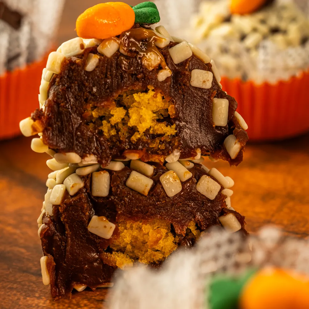 Macio, recheado com bolo de cenoura e coberto com carinho.